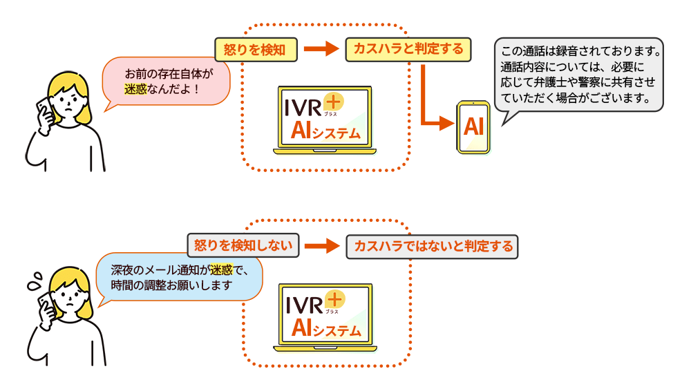 従来の電話応答システムによるカスハラ対策は「特定の単語」に反応する単語登録による判定が主流でした。 IVR+は、AI技術を活用し、お客様の電話中の発言を解析することにより、怒りの感情を検知します。 お客様がお怒りの場合、その状況を「カスハラランク1※」として自動的に識別します。 カスハラランク1が判定された場合、システムは今後の対応方法を音声案内でガイドし、適切な対応が行えるようにサポートします。